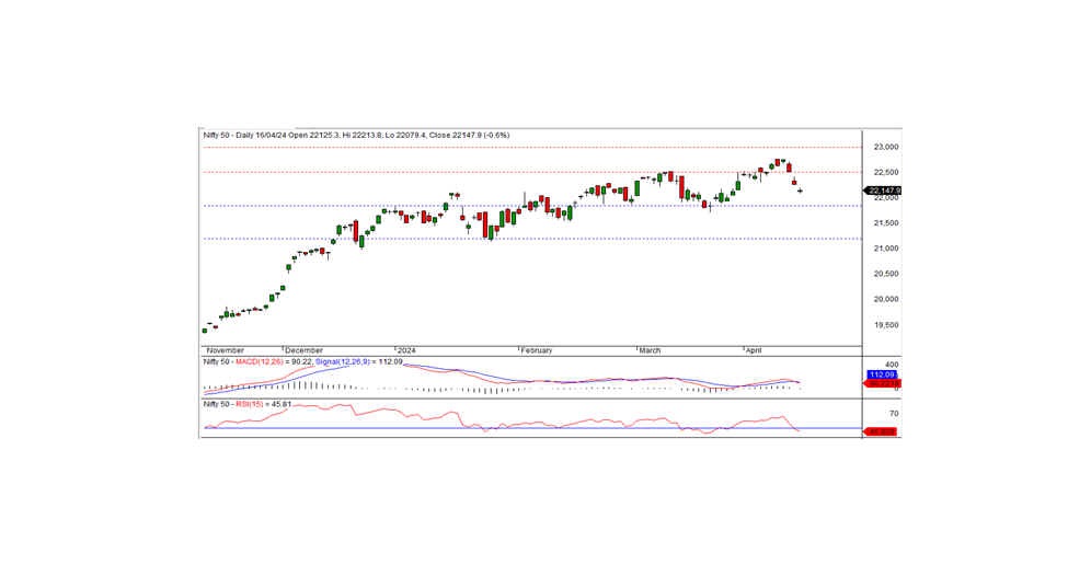 From a technical perspective, the Nifty concluded beneath short-term and medium-term moving averages, with momentum indicators signaling a negative trend. Despite forming a small white candle on the daily chart, it closed below the prior day's low, indicating a prevailing bearish momentum. In terms of support, the index finds a significant level at 22100, a breach of which may extend the downtrend. To initiate a potential rebound, the index must surpass the intraday resistance at 22200.