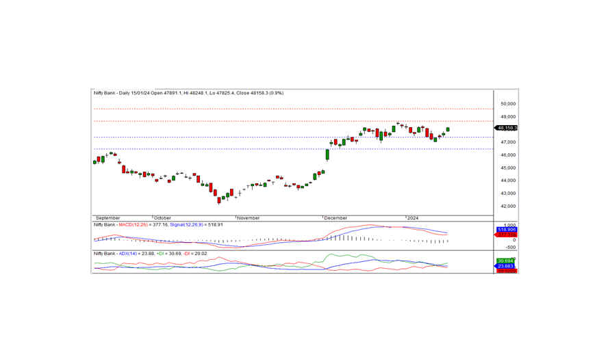 In the recent trading session, Bank Nifty concluded at 48,158.30, marking a significant gain of 448.50 points. Analyzing the technical aspects, momentum indicators suggest a neutral trend, yet the index closed above both short-term and long-term moving averages. Additionally, a white candle on the daily chart, closing above the previous day's level, indicates positive momentum. The intraday support for the index is identified at the 48,050 level, and the continuation of the upward trend is contingent upon the index remaining above this crucial threshold in the coming days. The nearest short-term resistance is anticipated at 48,650 levels.