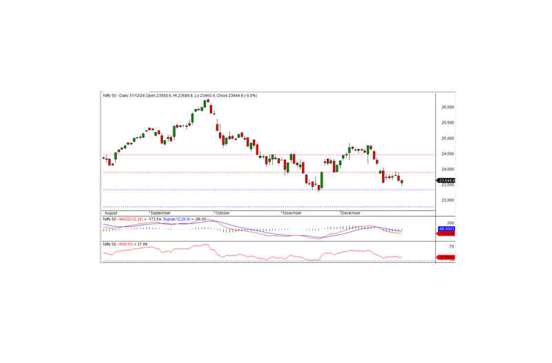 From a technical perspective, momentum indicators suggest a negative bias, with the Nifty trading below its short-term and long-term moving averages. However, the formation of a small white candle on the daily chart, coupled with a close near the previous day’s level, indicates the potential for consolidation. On the upside, the immediate intraday resistance remains at 23,700. A breakout above this level could trigger a pullback rally, while failure to do so may result in continued consolidation. On the downside, the index has key intraday support at 23,580; a breach below this could lead to further declines, with the next support at 23,460.
