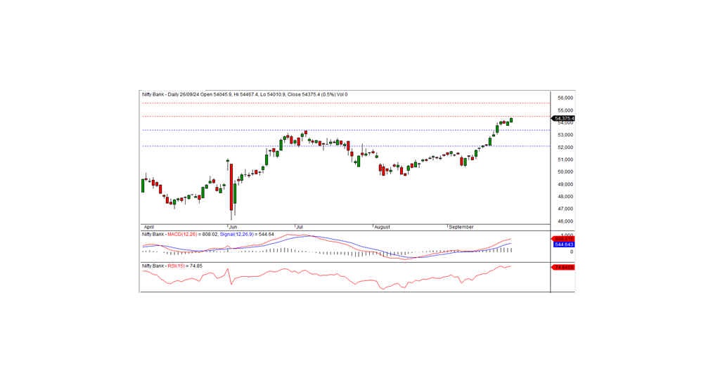 In the previous trading session, Bank Nifty closed at a record high of 54,375.35, gaining 273.70 points. From a technical perspective, momentum indicators signal a positive trend, with the index comfortably trading above both its short-term and long-term moving averages. Additionally, the formation of a white candle on the daily chart reinforces the bullish outlook, suggesting that the uptrend may continue.