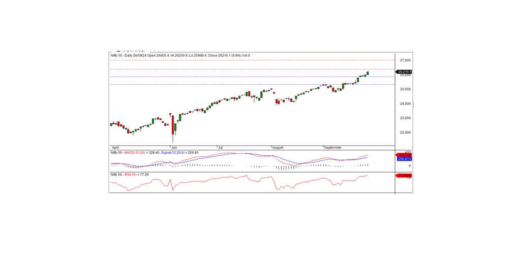 From a technical perspective, momentum indicators continue to signal a positive outlook. Nifty remains above both its short-term and long-term moving averages, and the formation of a white candle on the daily chart underscores the prevailing bullish sentiment. As long as the index holds above the 26,100 support level, further upside toward the 26,400 and 27,000 levels is likely. However, a break below this support could trigger a short-term correction. Traders should monitor key levels closely and take a cautious approach in the coming sessions.